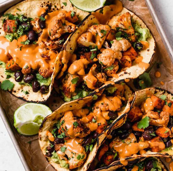 Vegan meat, black bean, spicy sauce, onion, cilantro and lime